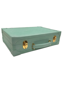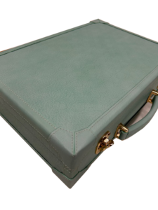 Le valigette si presentano con una silhouette compatta ed elegante, dalla struttura solida ma visivamente leggera. Il rivestimento in pelle martellata color verde menta pastello dona un carattere fresco ma sofisticato, contemporaneo senza risultare eccessivo.