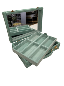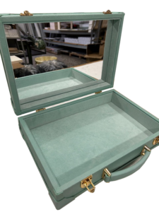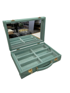 Il coperchio integra uno specchio a tutta larghezza incorniciato nella stessa pelle verde, mentre il vassoio estraibile, suddiviso in scomparti regolari, consente un’organizzazione impeccabile di accessori e oggetti personali.